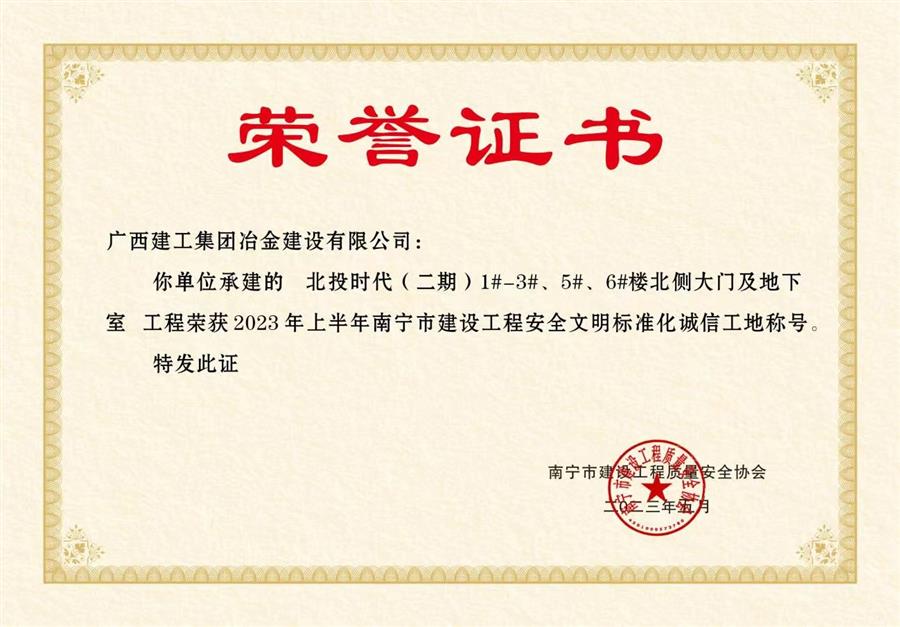 在項(xiàng)目黨支部全體黨員的共同努力下,項(xiàng)目榮獲了業(yè)主頒發(fā)的“2022年度優(yōu)秀總承包單位”和“工程施工類(lèi)優(yōu)質(zhì)供應(yīng)商獎(jiǎng)”獎(jiǎng)項(xiàng),2023年5月項(xiàng)目榮獲2023年上半年南寧市建設(shè)工程安全文明標(biāo)準(zhǔn)化誠(chéng)信工地稱(chēng)號(hào)。