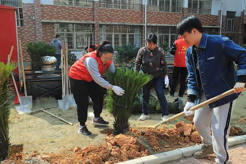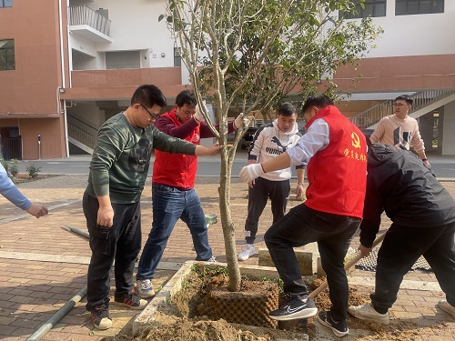 活動(dòng)中,基礎(chǔ)分公司黨員志愿者與銀山小學(xué)教職工熱情高漲,分工協(xié)作,有的松土挖坑、有的扶苗填土、有的澆水育苗,現(xiàn)場(chǎng)一派熱火朝天的忙碌景象。在大家的共同努力下,本次活動(dòng)共種植山茶花、鐵樹(shù)、桂花樹(shù)等樹(shù)苗60多棵。