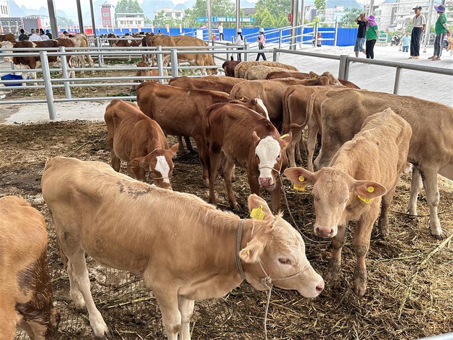 活動現(xiàn)場,熱鬧非凡,大家參觀了農特項目園區(qū)及桂中牛行,并對園區(qū)今后的發(fā)展提出了意見和建議。桂中牛行作為農特項目園區(qū)內的首個主力商家,主營活牛羊交易,副營馬、驢、騾子等草食動物交易。試業(yè)當天,牛群“哞哞”聲此起彼伏,一頭頭體格健壯的牛兒一字排開,人們三五成群地圍聚在一起,仔細挑選著心儀的牛兒。一旁的牛崽交易市場內,買家更是爭相搶購體態(tài)良好的牛崽,市場交易紅火。