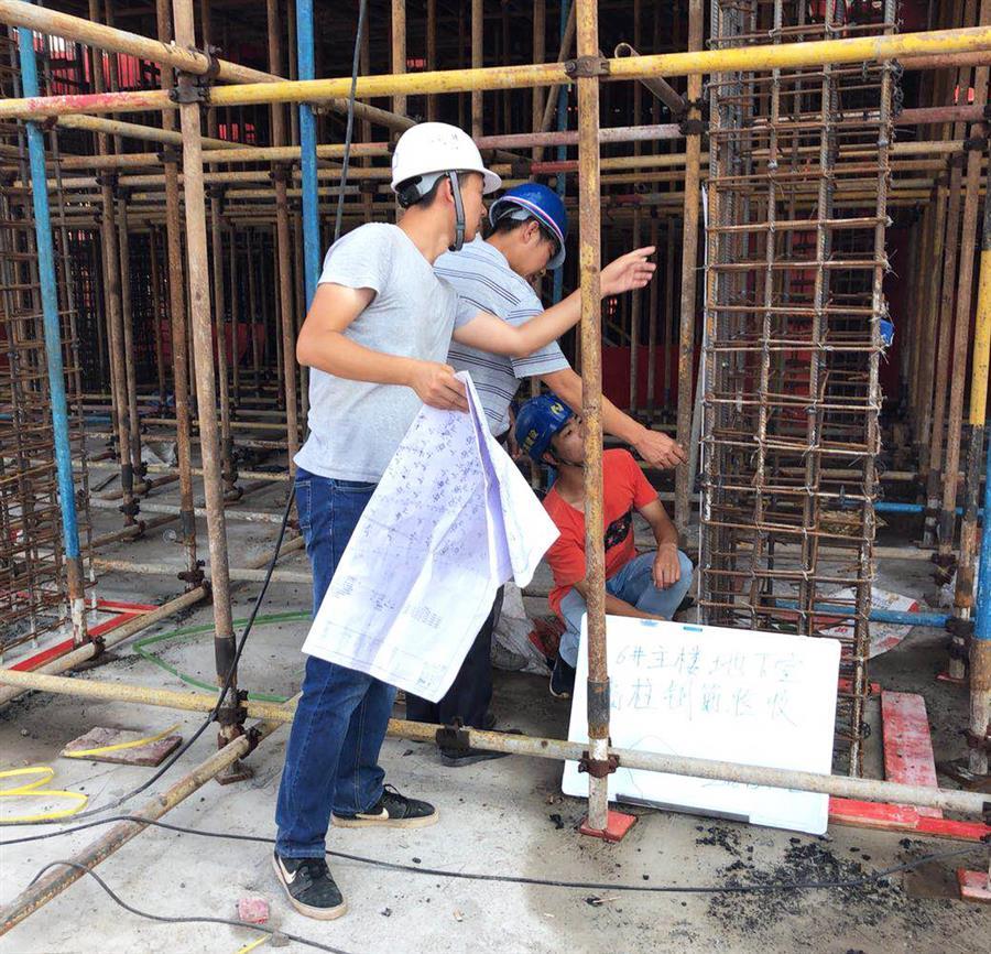 6月18日,在桂華分公司承建的梧州佛子時代廣場項目現(xiàn)場,當空烈日讓偌大的工地一片熾熱,焊花飛濺,工程車來來往往,工人們揮汗如雨。雖然施工作業(yè)已經(jīng)避開了高溫時段,但工人們?nèi)员缓顾粤搜劬?,濕了衣服。盡管這樣,大家仍堅持“全副武裝”,手套、防護用具,安全帽,一樣都沒有少,自覺遵守安全文明施工相關規(guī)范。入行兩年的施工員趙俊財抹了一把汗說道:“剛參加工作時,不能和家人一起過節(jié)還挺難受的,后來把心態(tài)調整好了,想著只要家人安好,其實比什么都重要,趁著年輕,還是應該多奮斗?!笨粗幻装舜髠€的他手拿圖紙和卷尺,蜷縮著身子,蹲在空間有限且熱得發(fā)燙的平臺上仔細檢查剛剛綁扎好的鋼筋籠,驕陽烤得他黝黑的皮膚泛出一層水光,襯著那還略顯年輕的臉龐,顯得熠熠生輝。