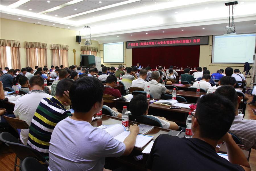 《文明施工與安全管理標準化圖集》為廣西建工集團有限責任公司組織編制,是廣西建工集團及所屬各公司共同遵守和執(zhí)行的安全文明施工標準,是實現(xiàn)廣西建工集團安全文明標準化生產(chǎn)的重要文件,其內(nèi)容分為五大部分,分別為:安全標準化管理、現(xiàn)場安全文明施工標準做法、安全色與安全文化、信息化管理、綠色施工等,其中包含安全防護措施和文明施工效果圖、平面圖、大樣圖、做法說明,涵蓋了項目組織機構(gòu)、安全教育、安全檢查、應(yīng)急救援、現(xiàn)場圍墻、大門做法、場地硬化、腳手架、基坑防護、高處作業(yè)、模板支架、塔吊、施工升降機、施工用電、起重吊裝、施工機具、辦公區(qū)、生活區(qū)設(shè)置、員工工作服、安全帽設(shè)計等,基本包括項目施工安全文明標準化管理全部內(nèi)容,整個圖集觀看簡便、操作方便,適用性強。培訓過程中,蔣小緩副處長全面詮釋了標準化圖集各分部分項的要求和做法,展示現(xiàn)場實做正確與錯誤的照片,并播放了廣西兆安·現(xiàn)代城安全文明標準化示范工地視頻短片,豐富了培訓內(nèi)容,活躍了課堂氣氛,提高了培訓質(zhì)量,各參加培訓人員認真傾聽,做好筆記,課堂紀律良好,使培訓達到了應(yīng)有的培訓效果。