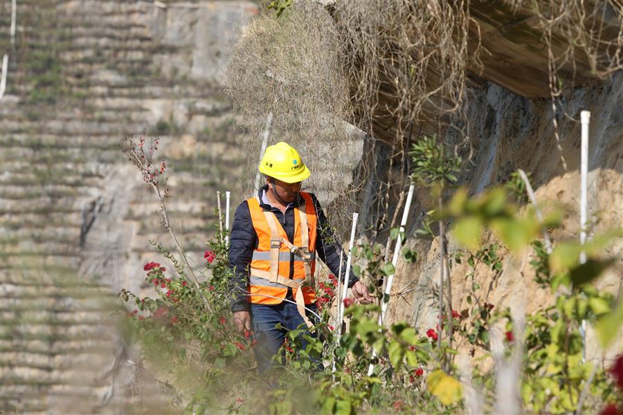 2021年12月19日,工人在樓梯山的峭壁上養(yǎng)護(hù)綠植。