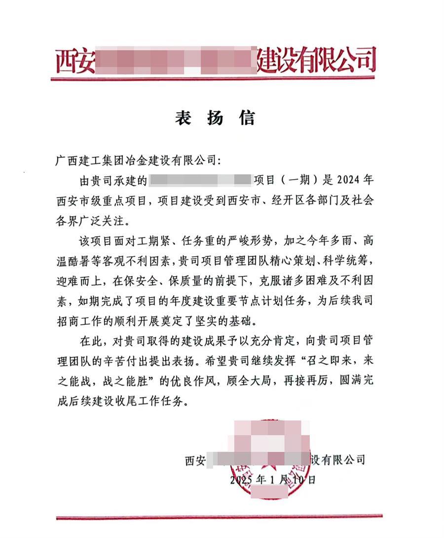新年伊始,喜訊傳來!近日,冶建公司收到遠在千里之外的項目業(yè)主寄來一封《表揚信》,信中對冶建基礎分公司承建項目的管理水平高、建設速度快、工程質量優(yōu)“點贊”,向全體項目管理人員的辛苦付出提出表揚,對公司取得的建設成果予以充分肯定。