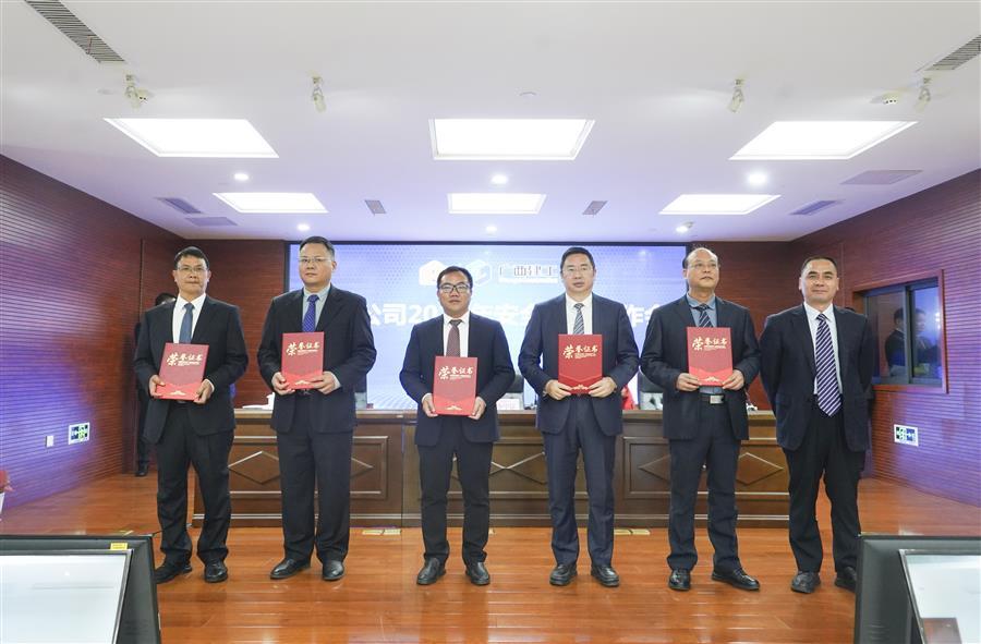 公司董事長、黨委書記覃振華(右三)上臺(tái)領(lǐng)取2024年隊(duì)伍建設(shè)工作專班獎(jiǎng),公司總經(jīng)理、黨委副書記蒙勝益(左一)上臺(tái)領(lǐng)取2024年管理費(fèi)用控制工作專班獎(jiǎng)