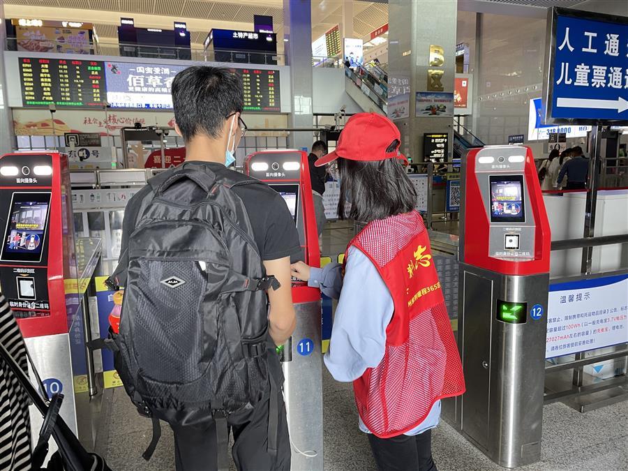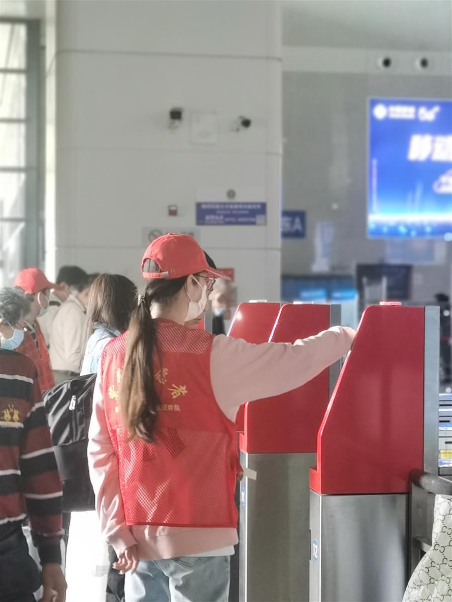 冶建志愿者們在火車站協(xié)助車站工作人員做好疫情防控工作,在進(jìn)站口給乘客測體溫,核實健康碼、行程碼、核酸證明,引導(dǎo)乘客刷身份證進(jìn)站、為進(jìn)出站的乘客指路。