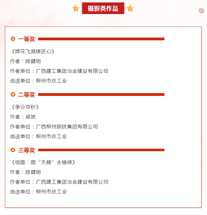 據(jù)了解,自活動啟動以來,全市各級工會和廣大職工朋友積極響應,共報送各類作品124件,柳州市共有14件優(yōu)秀作品獲獎,其中公司有2件作品獲獎,分別是《焊花飛濺鑄匠心》和《組圖:爬“天梯”去植綠》。